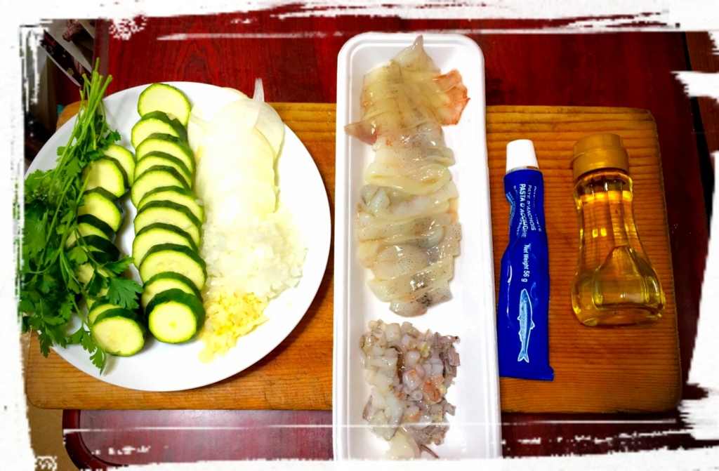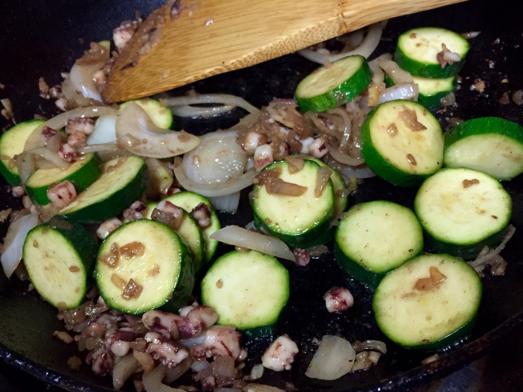 このように、玉ねぎはみじん切り、スライス、ニンニクはみじん切り、ズッキーニは少し厚めに輪切りにします。イカは内蔵を取りだし、中をキレイに洗います。ゲソの部分は細かく切り、胴体の部分は輪切りにします。
