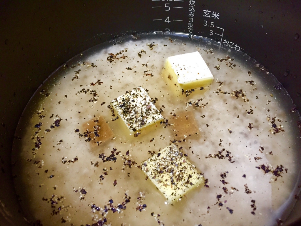 そしたら、上のバターライスの材料のパプリカパウダー、チリパウダー以外を炊飯ジャーに入れて炊きます!パプリカパウダー、チリパウダーは炊けてからお好みで混ぜてください!