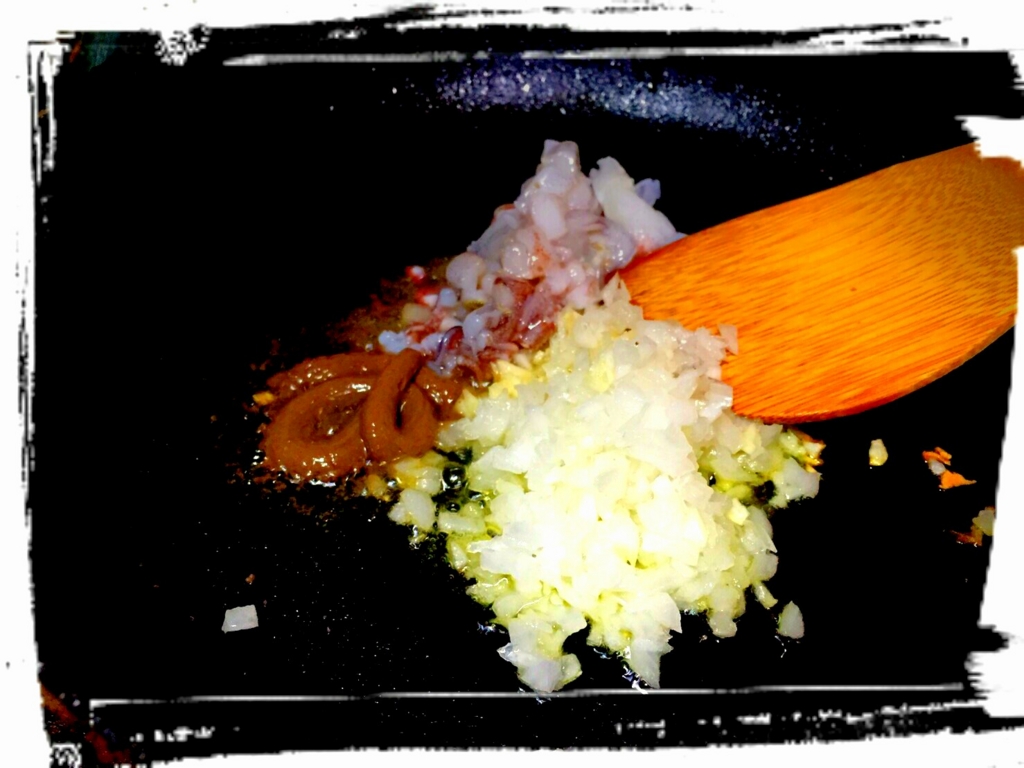 まず、フライパンにオリーブオイル、アンチョビ(今回はペースト)とニンニク、玉ねぎのみじん切り、イカのゲソを入れて弱火で炒めてきます。