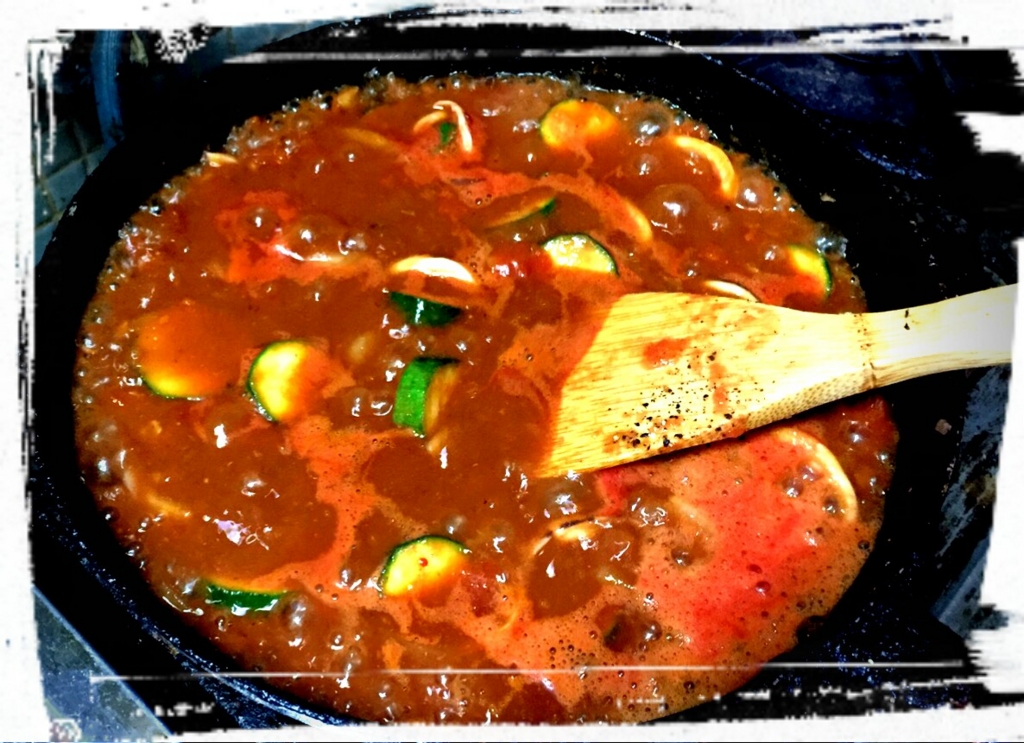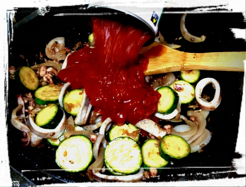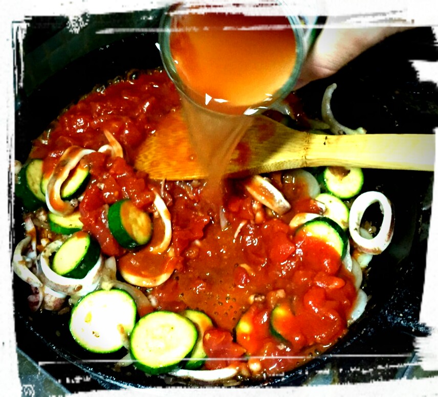 イカが少し色付いてきたら、トマトホール缶、水をいれます!