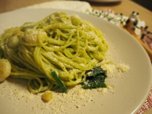 濃厚なパスタソースなのでよく絡むように太めのスパゲティを使いましょう!
