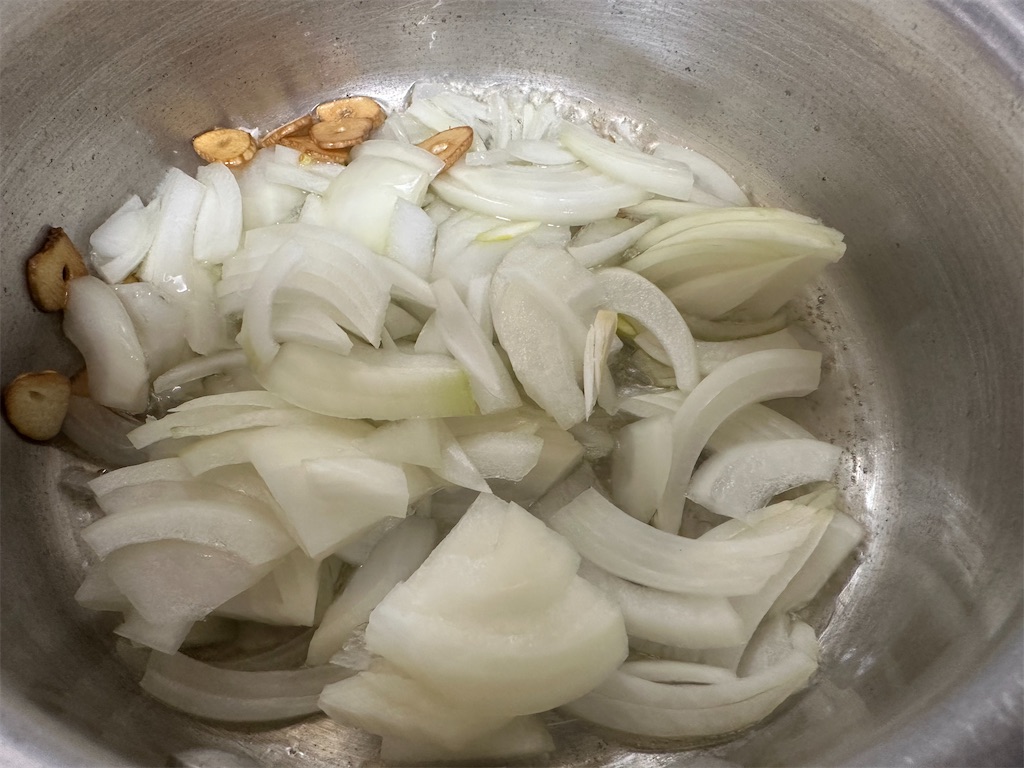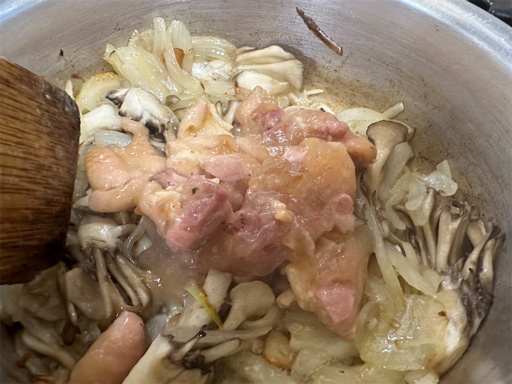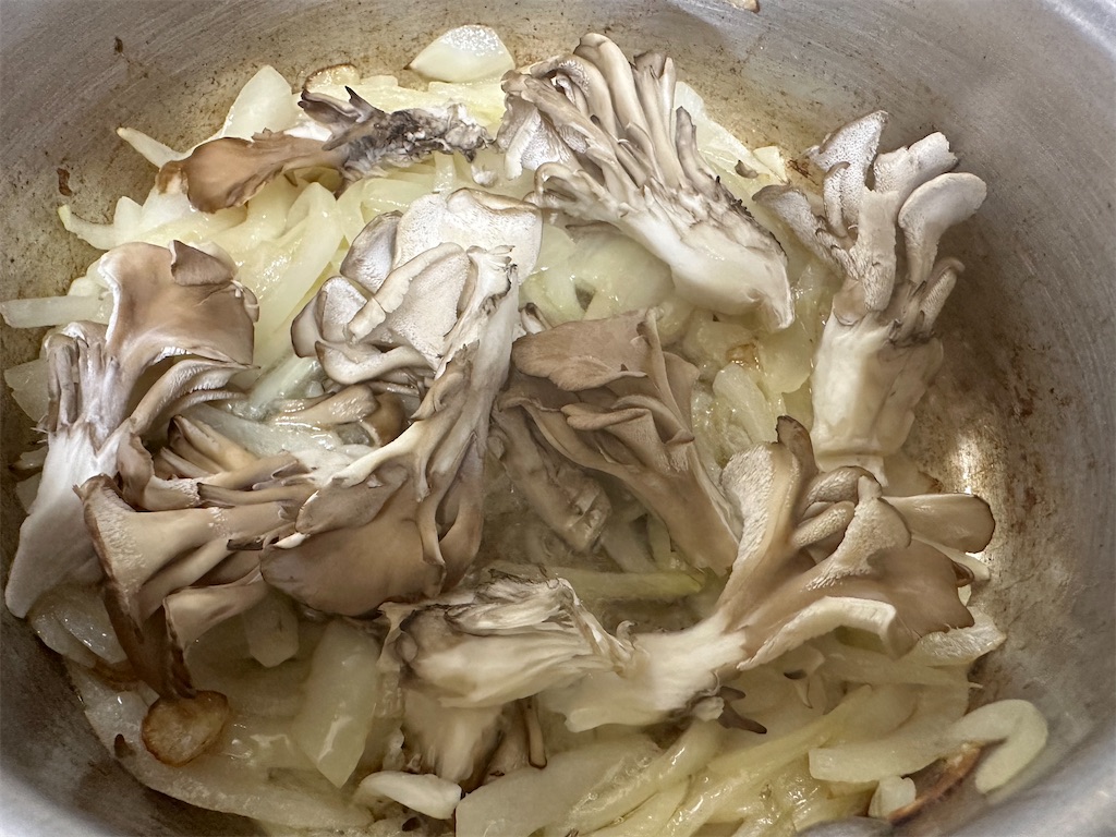玉ねぎが色づいてしんなりしてきたら、マイタケをいれます。