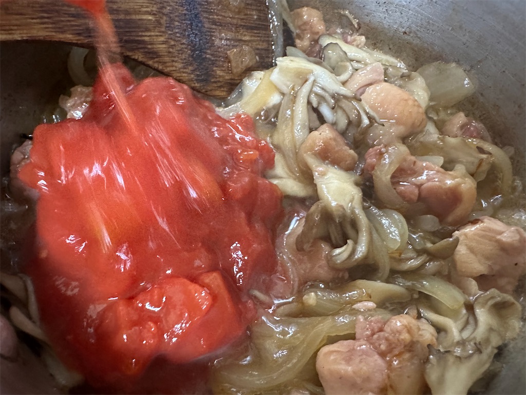 鶏肉の香りがしっかりしてきたら、トマト缶をいれます。