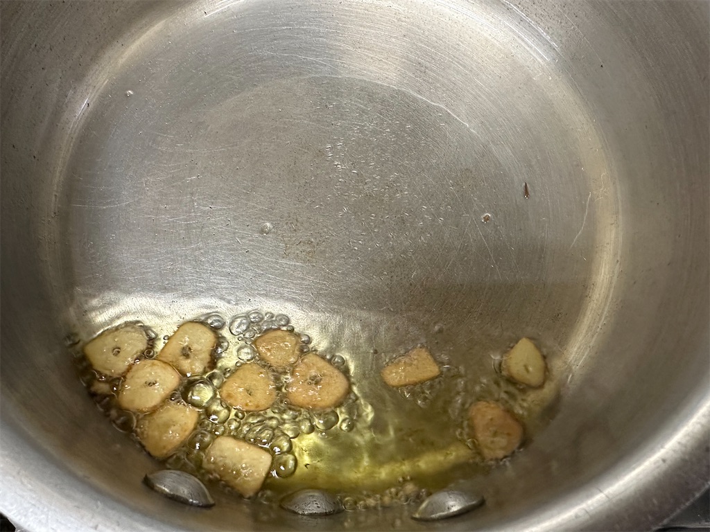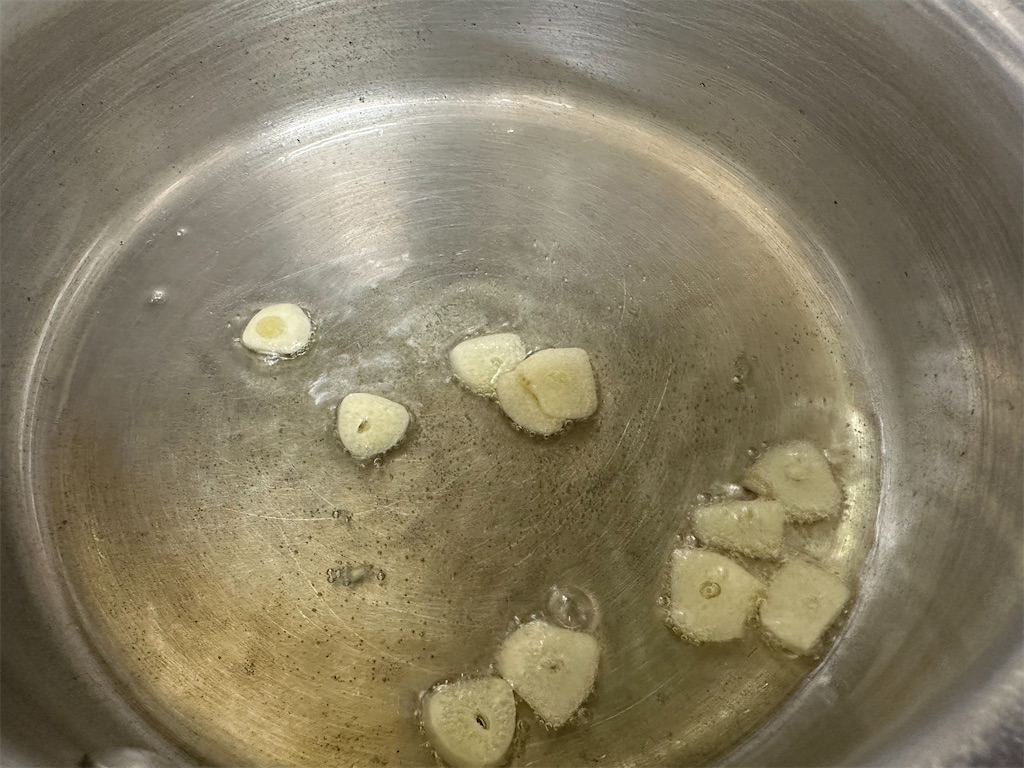 鍋にオリーブオイルを入れて、ニンニクを弱火で炒めていきます。