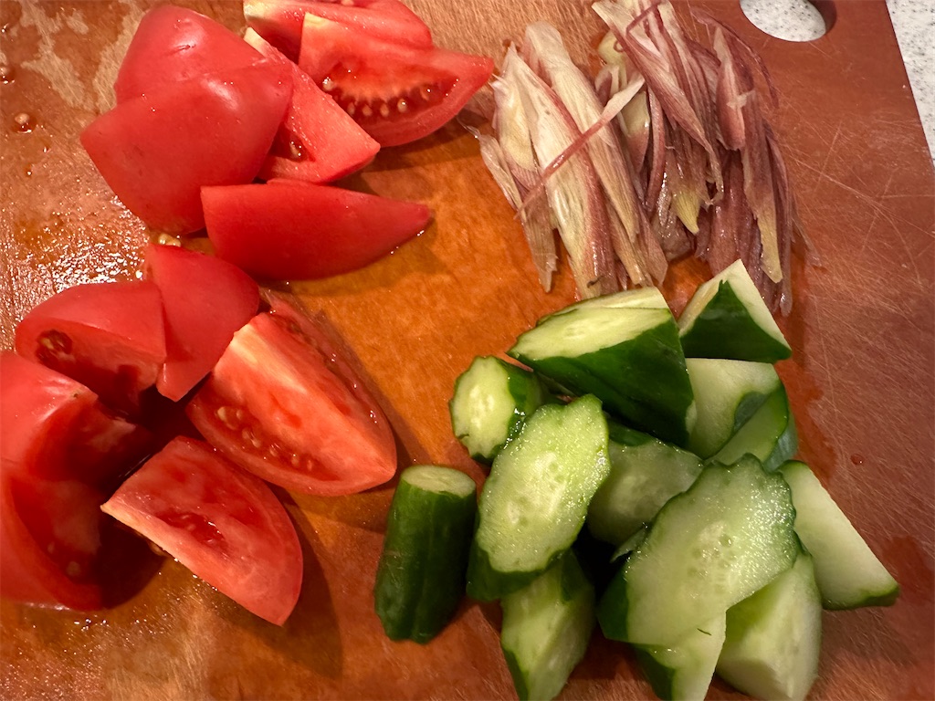 きゅうりは乱切り、トマトはくし切りで6等分に、ミョウガはスライスします。