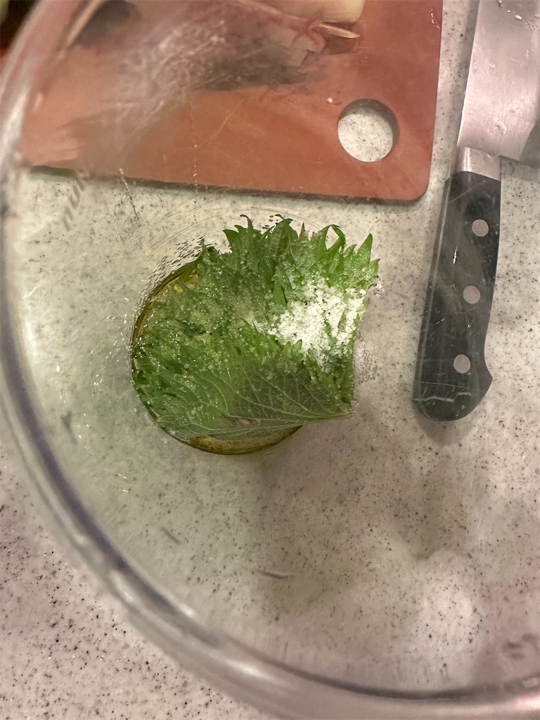 大葉とオリーブオイル、塩をひとつまみ入れて、ミキサーにかけます。