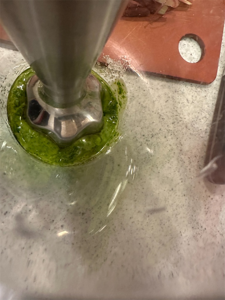バジルでもつくることができますが、大葉でペーストを作ると、みょうがやきゅうりなど和の食材にマッチします。