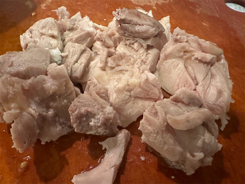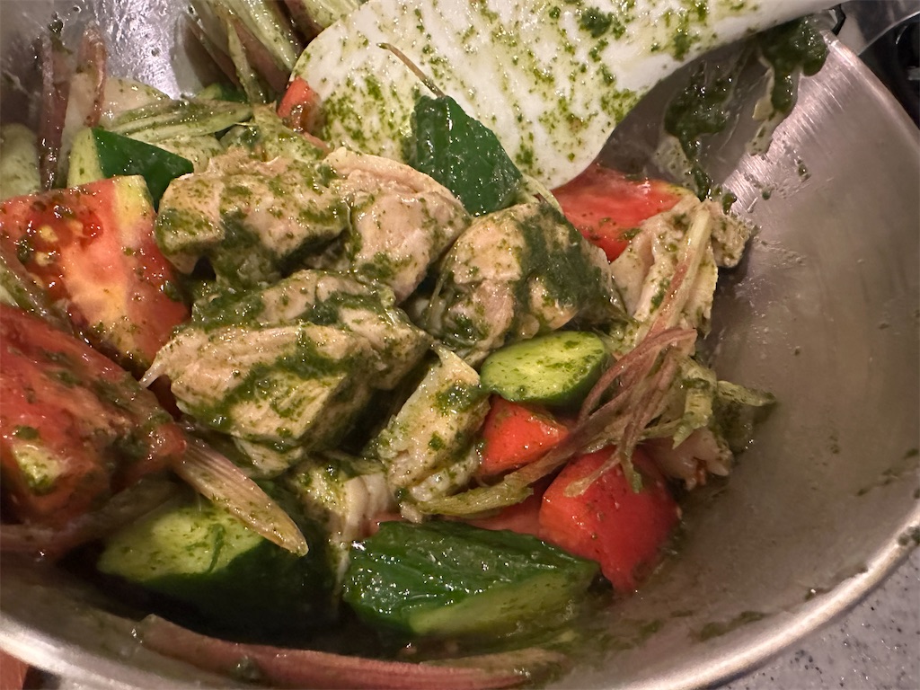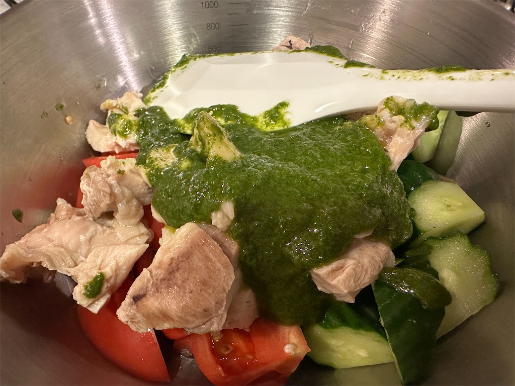 鶏肉がある程度冷めてから和えましょう。
