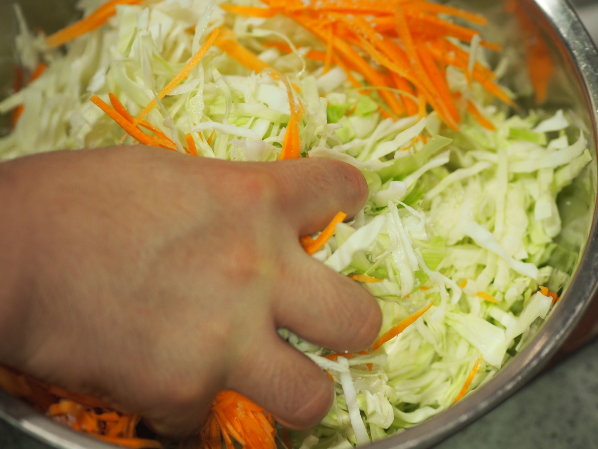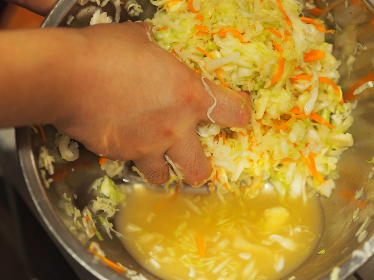 塩をしっかりと揉み込むとキャベツが柔らかくなり、塩が馴染みます。