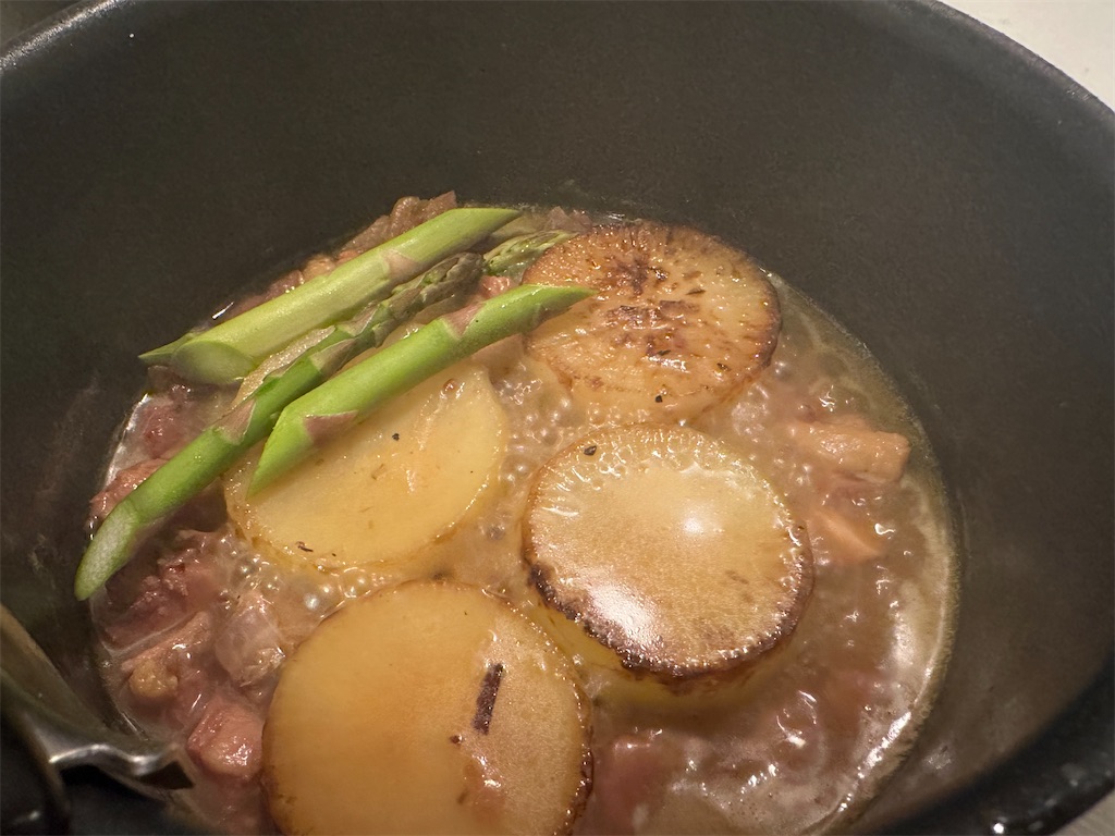 仕上がる3分ほど前に、半分にカットしたアスパラを入れて火をいれます。