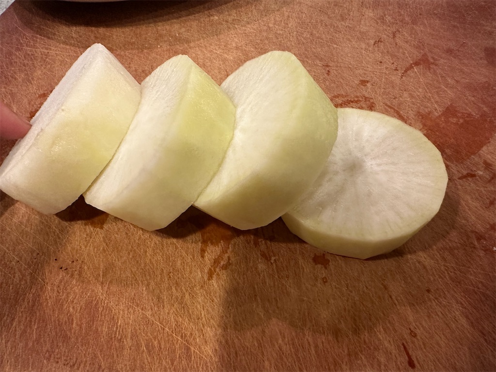 大根の皮を剥き、4センチほどの厚さにカットして、塩・胡椒で両面に味付けをします。