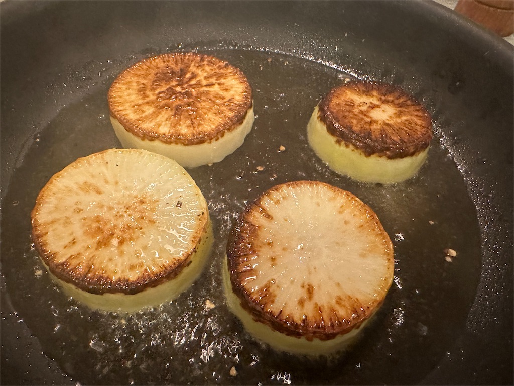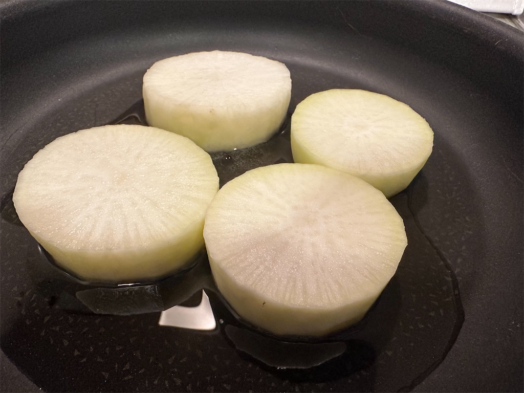 フライパンを強火で熱したら、オリーブオイルを入れて大根に焼き色をつけます。