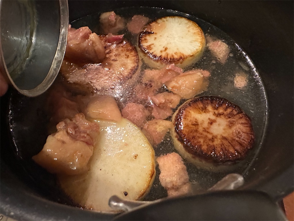 クイーンアリスの石鍋シェフのフォワグラ大根をベースに、缶詰でアレンジしました。