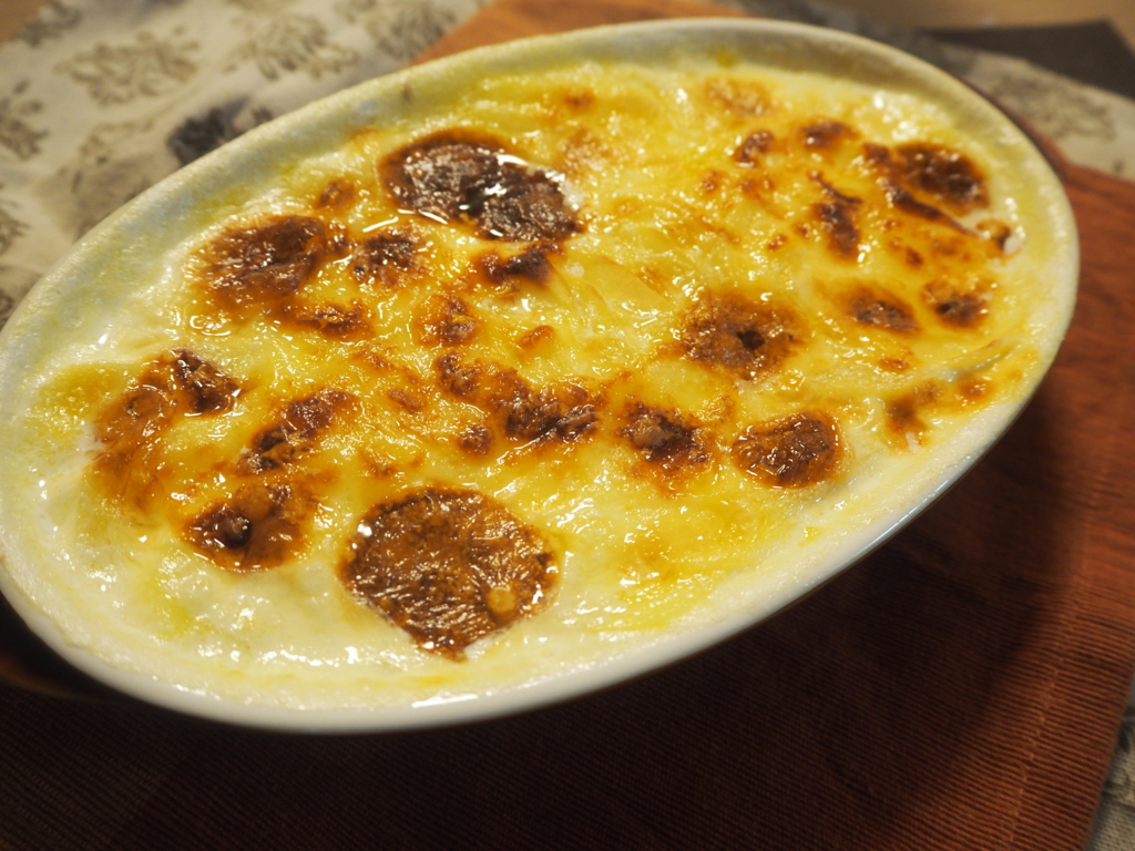 フランスの郷土料理で、スライスしたじゃがいもを重ね、チーズと生クリームで焼いたグラタンです。
