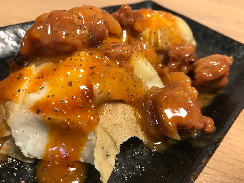 あとはジャガイモを盛り付けて、やきとりバターをかけたら完成です。