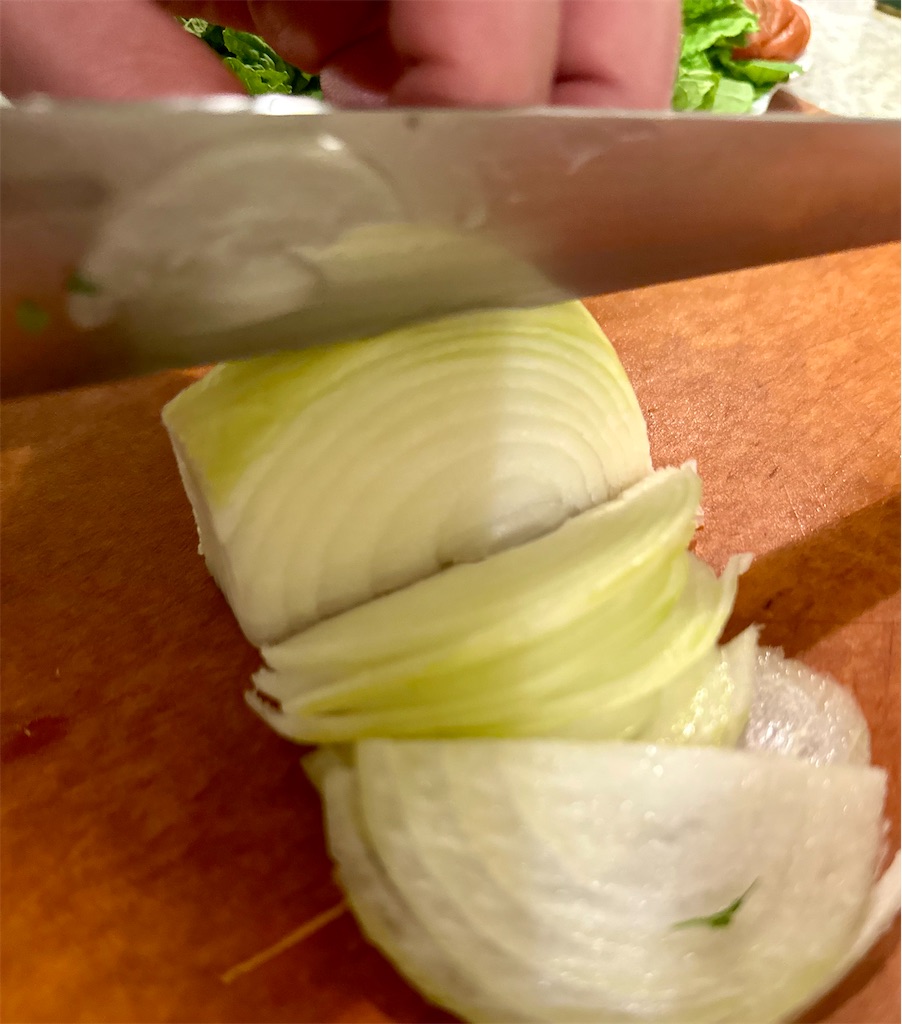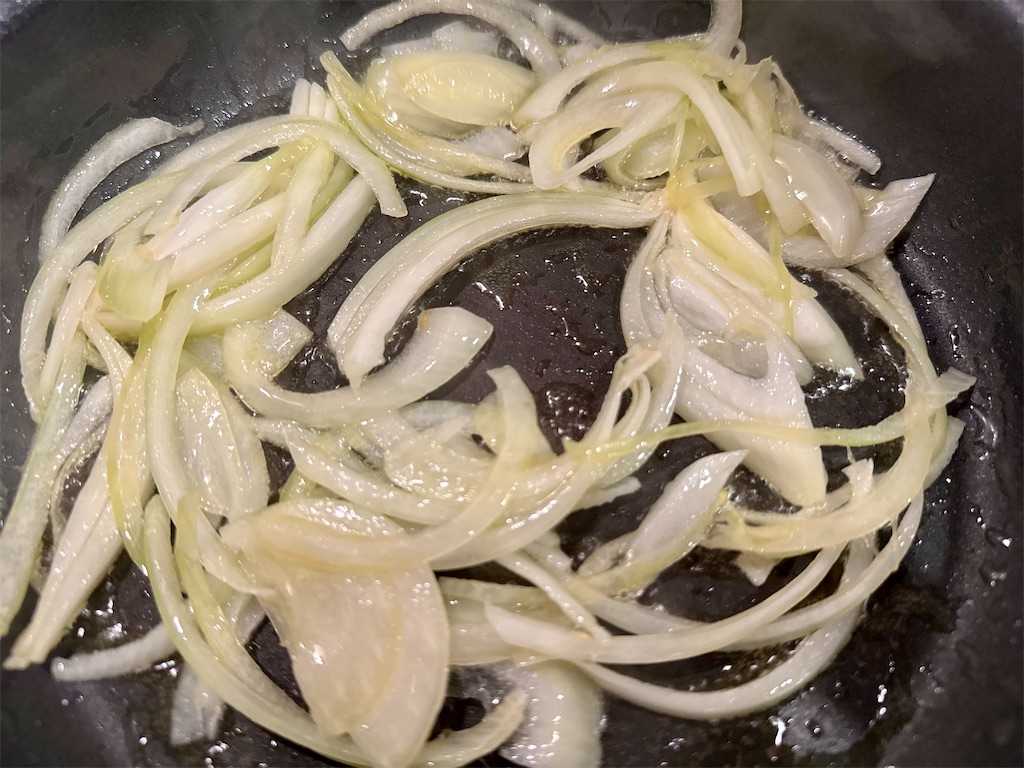 フライパンにオリーブオイルをいれて、強火で熱して玉ねぎをいれます。