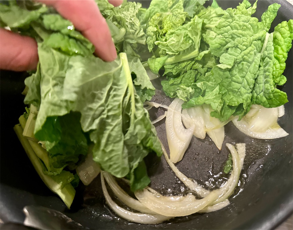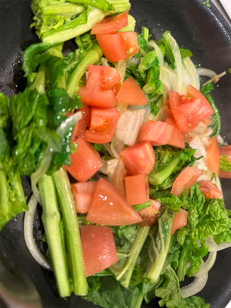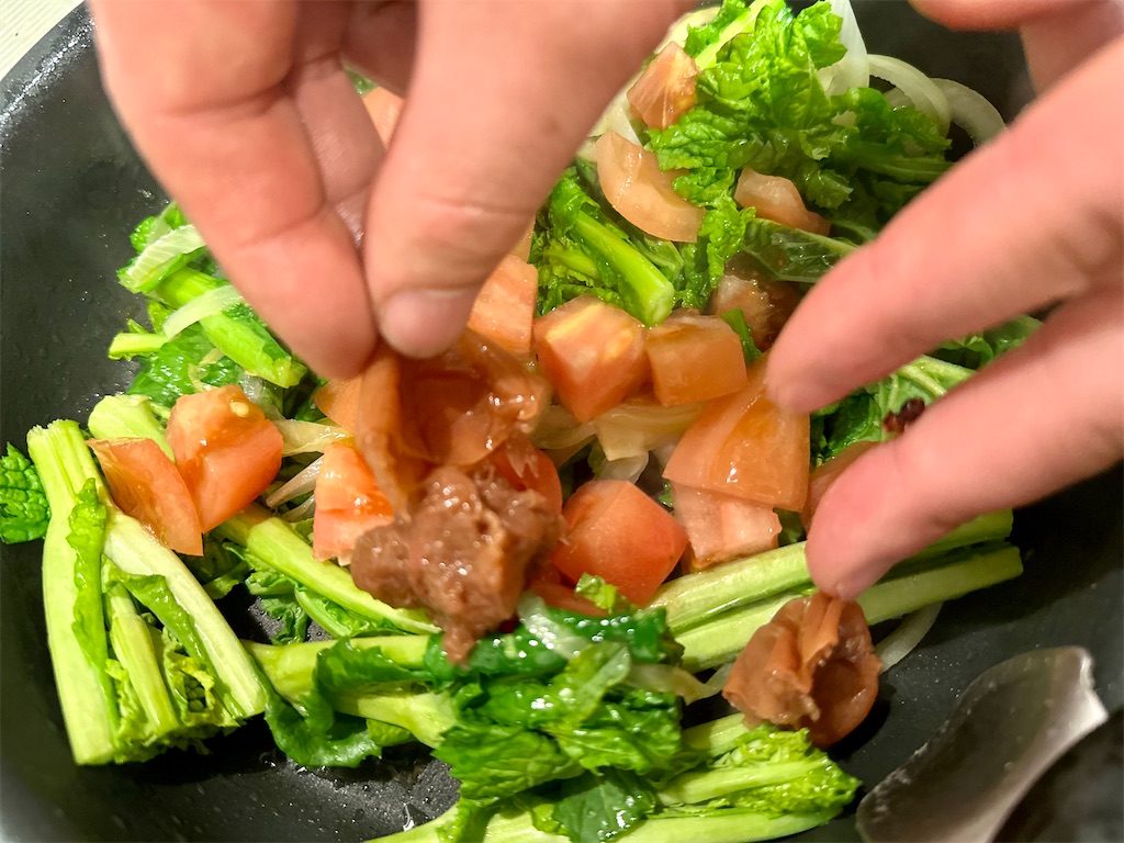 玉ねぎがしんなりしてきたら、菜の花をいれて