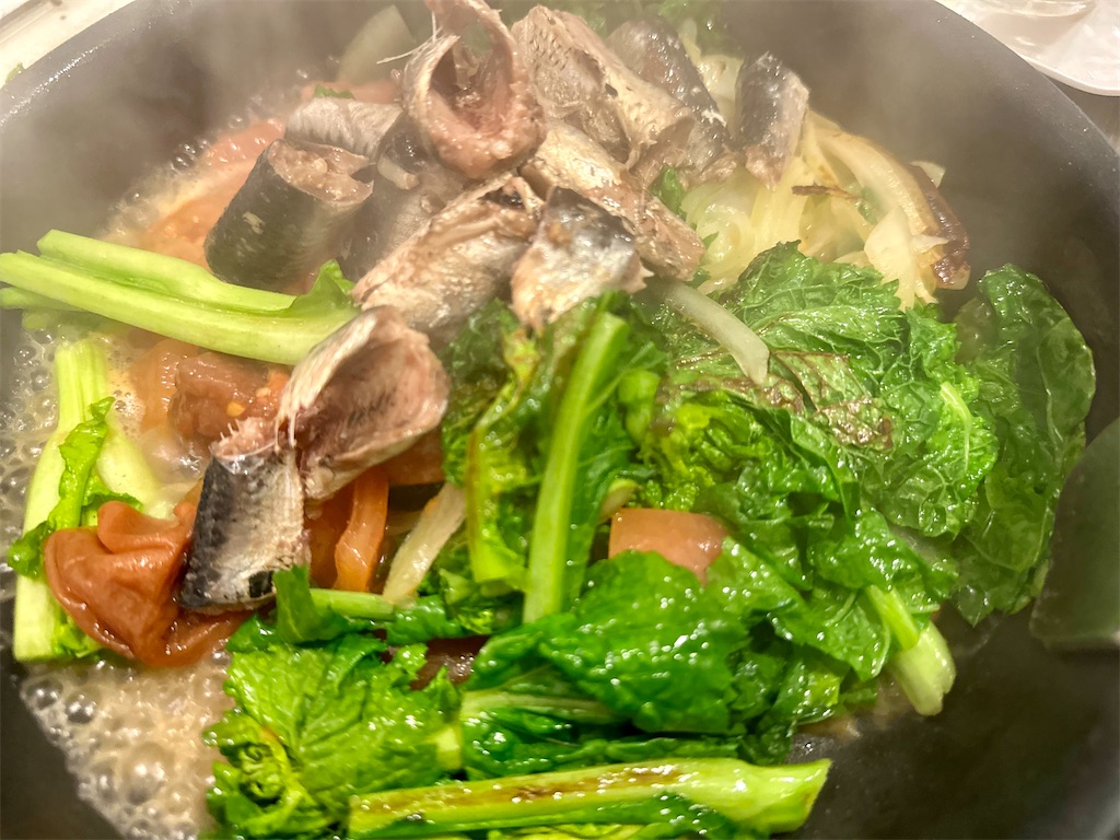 イワシの水煮缶(汁ごと)、白ワインを入れて、蓋をして1分程加熱します。
