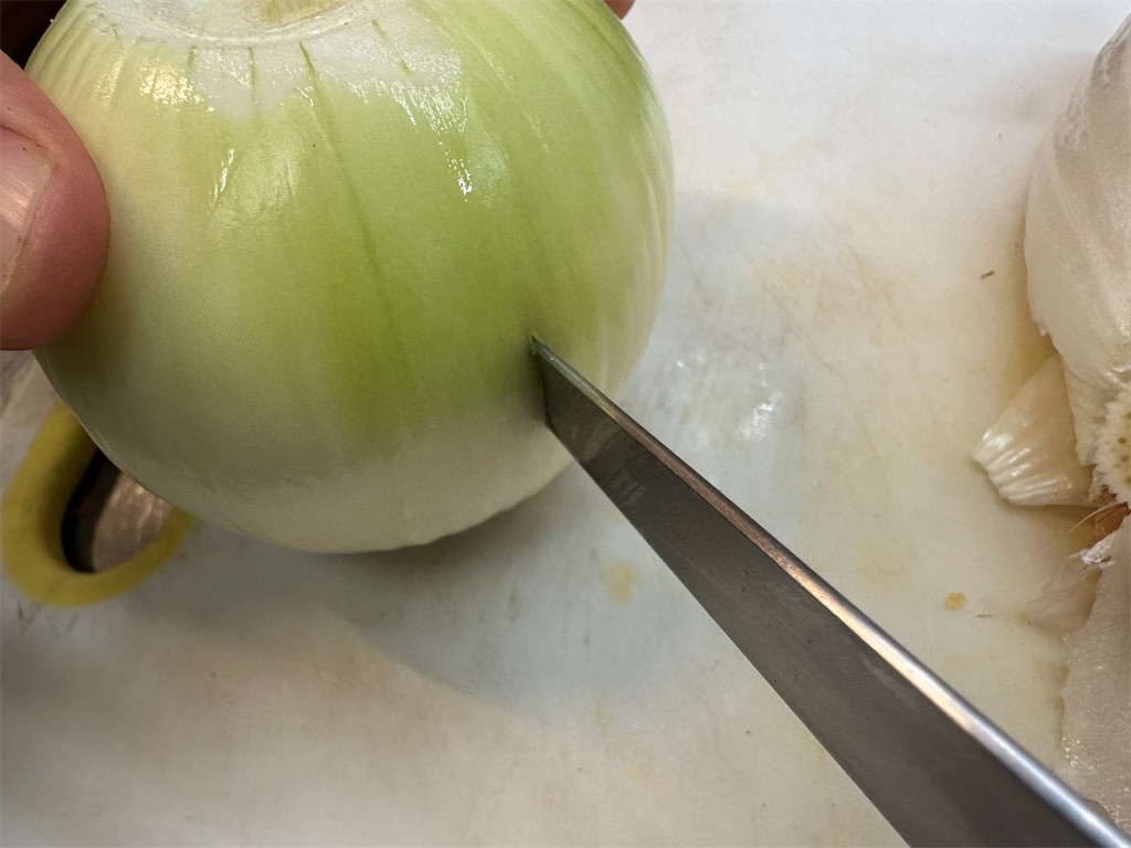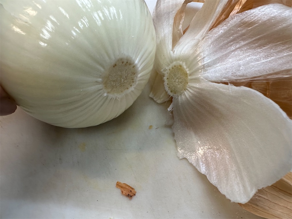 玉ねぎは皮をむきますが、写真のように芯の部分を残すように皮をむきましょう。