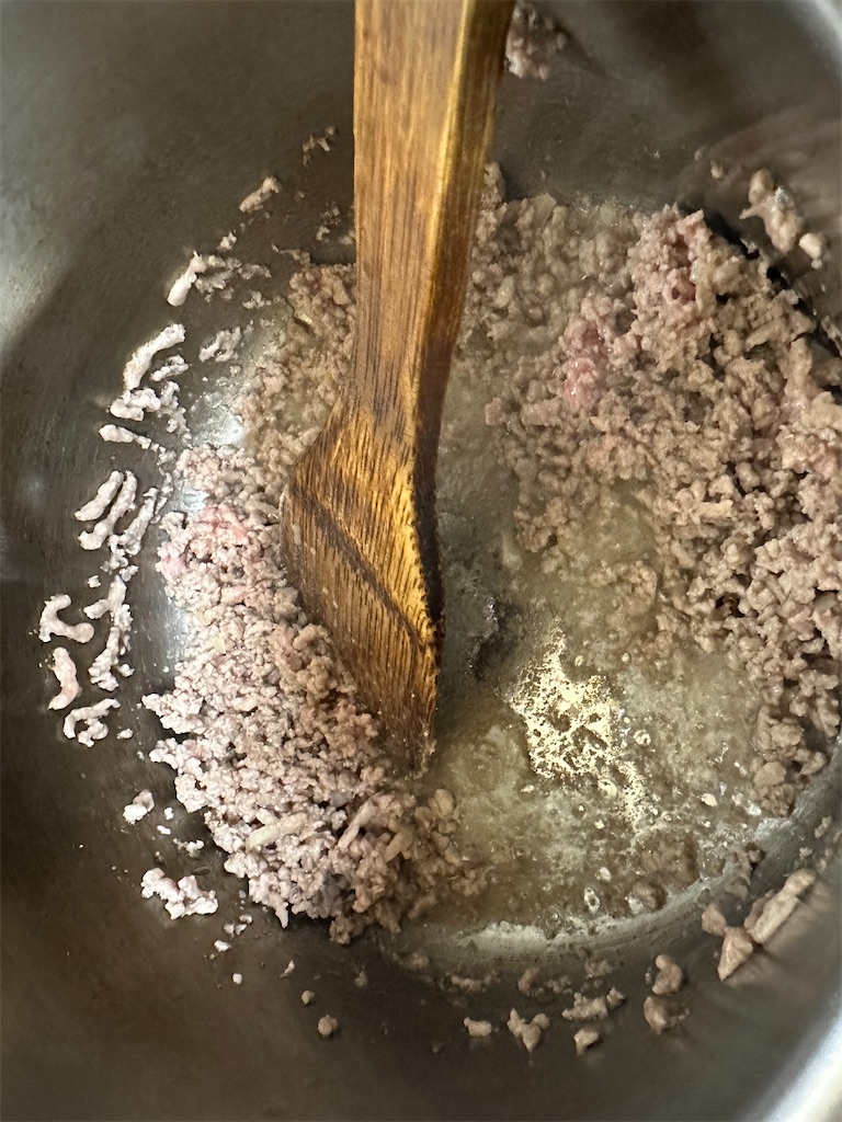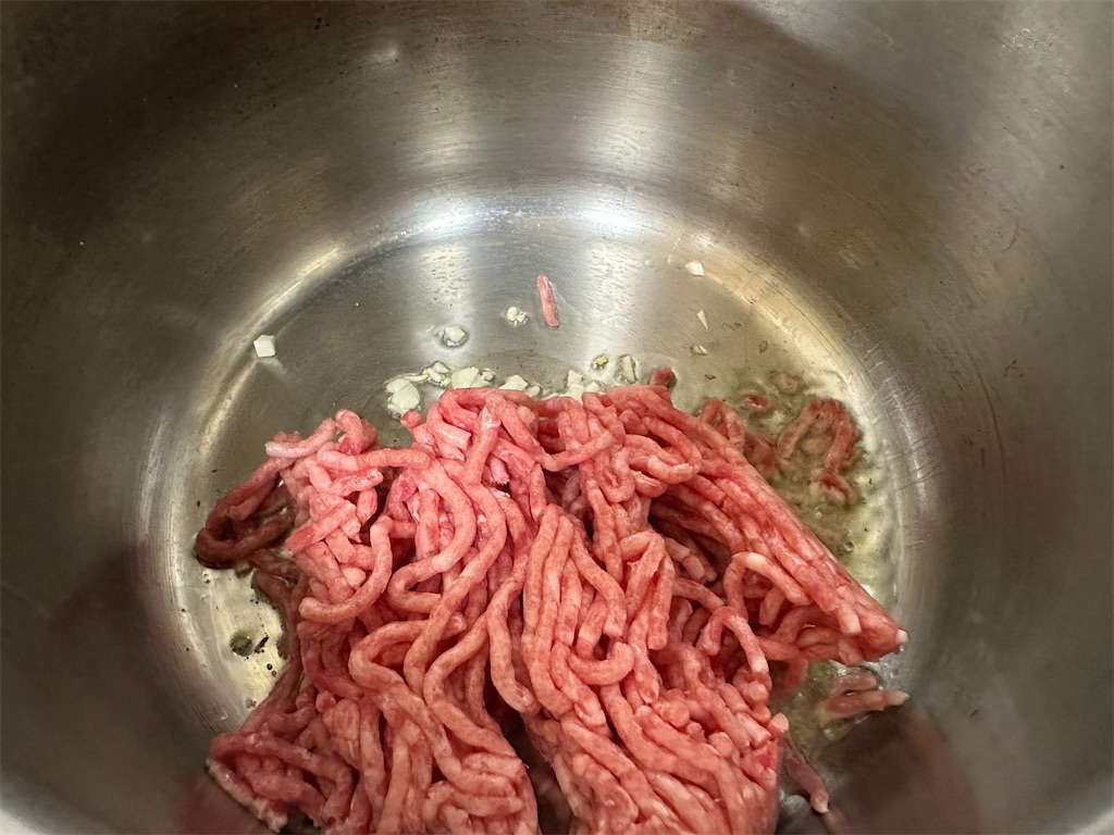 にんにくがふつふつしてきたら、合い挽きを入れて炒めていきます。