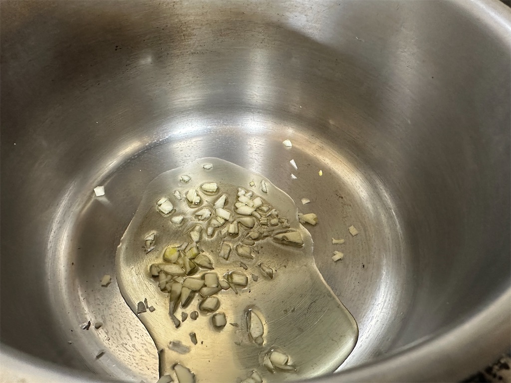ニンニクをみじん切りにして、フライパンにオリーブオイルを入れて中火で熱します。