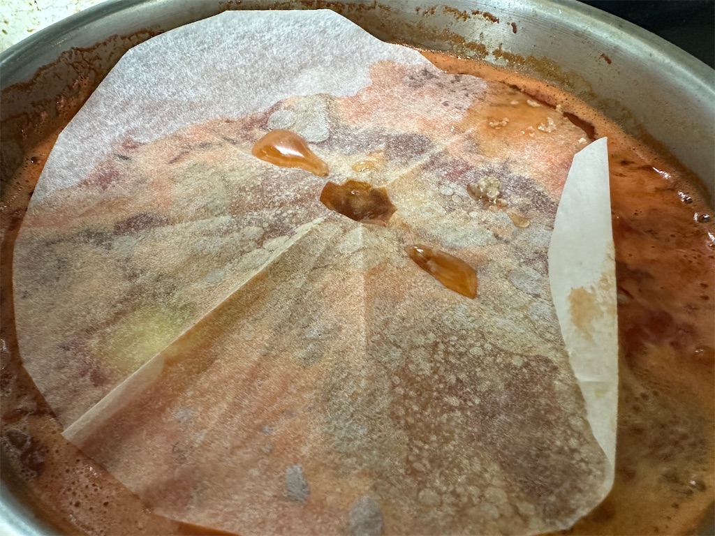 沸騰したら、弱火にしてクッキングペーパーで落とし蓋をします。