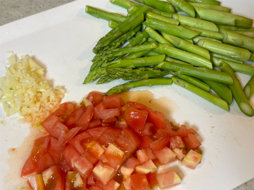 ニンニクはみじん切りに、トマトは5ミリほどの角切りに、アスパラは幅3センチほどで斜めにカットします。