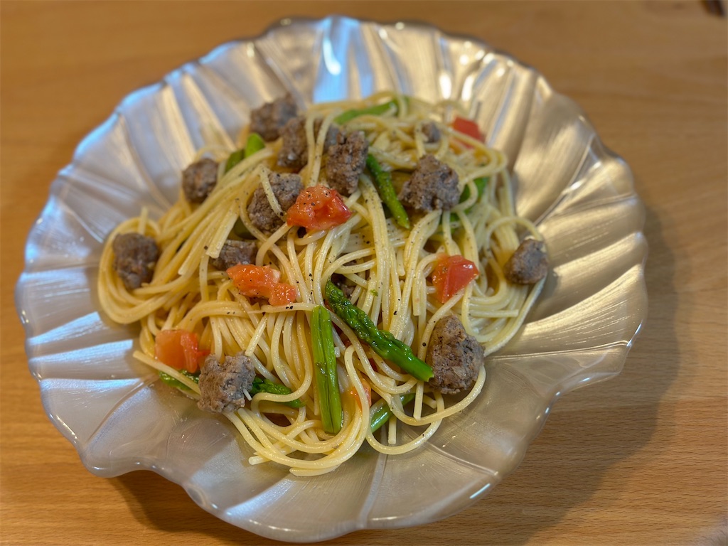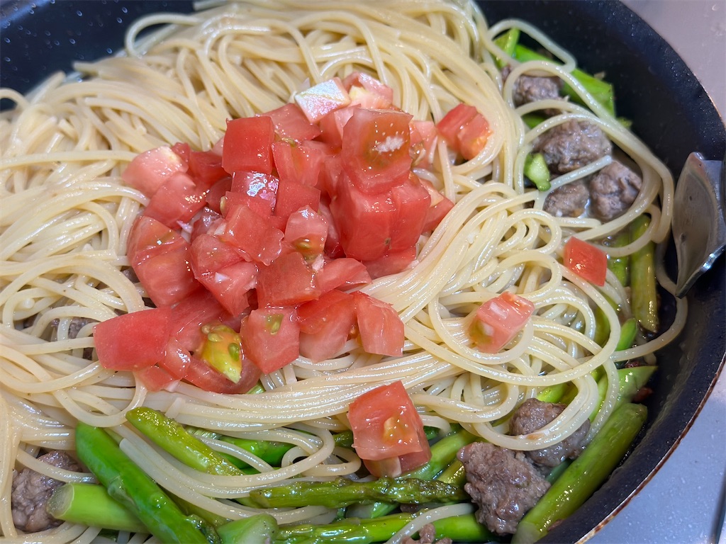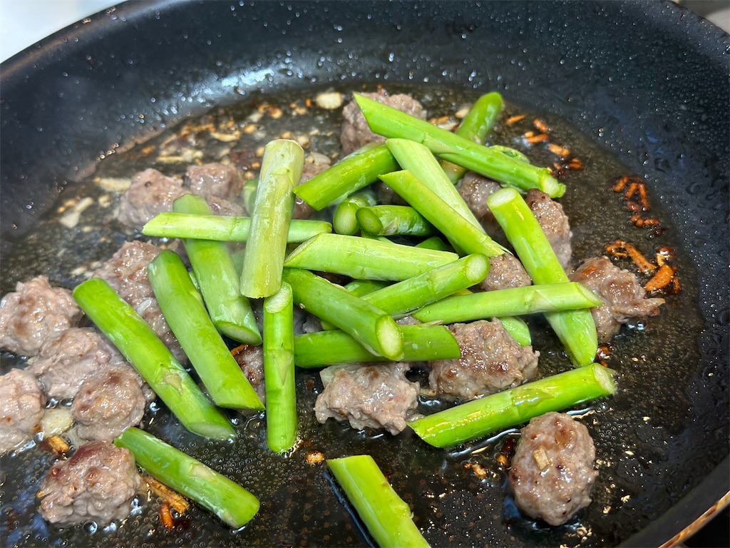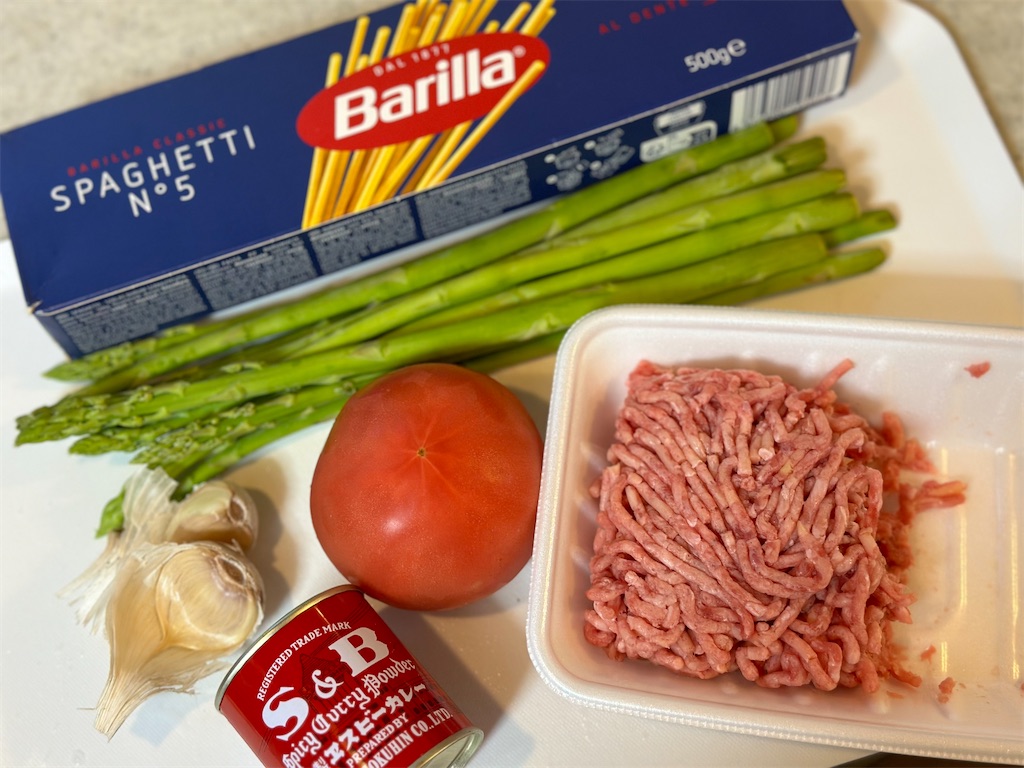 それでは「ミンチとアスパラのスパゲティ」作っていきましょう。
