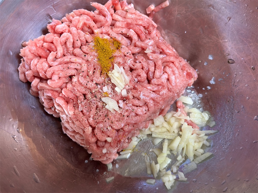 ボールにミンチ、カレー粉、ニンニクのみじん切り半分、ブラックペッパー、塩を入れます。