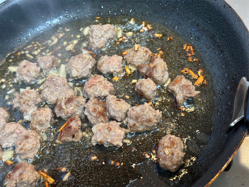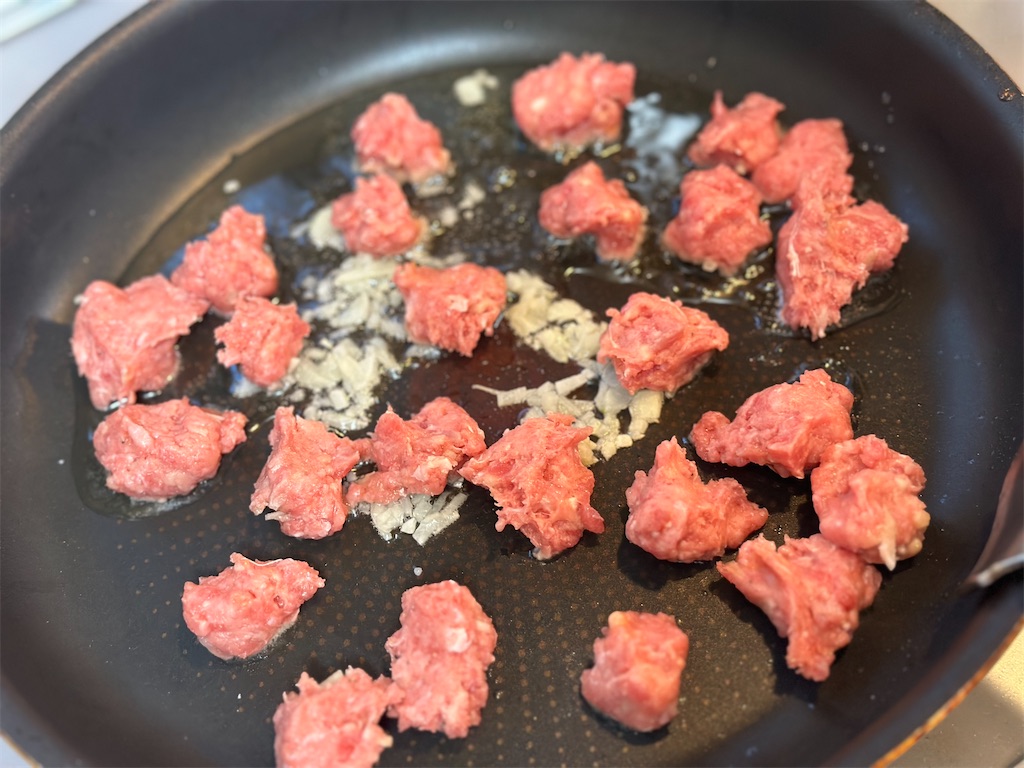 ニンニクがふつふつしてきたら、ミンチを1センチほどの大きさでちぎり、焼いていきます。