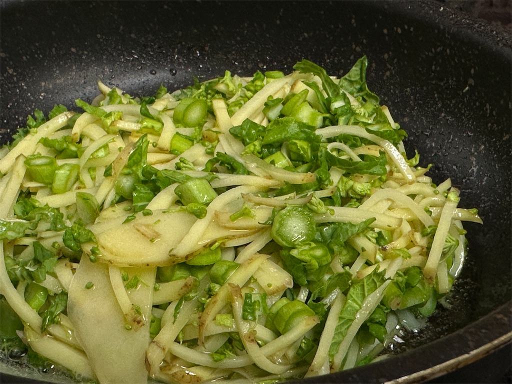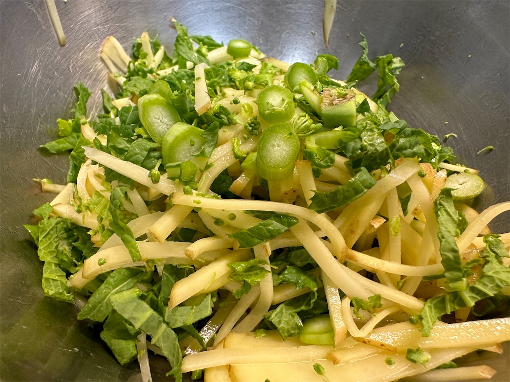切れたら、じゃがいもと混ぜます。