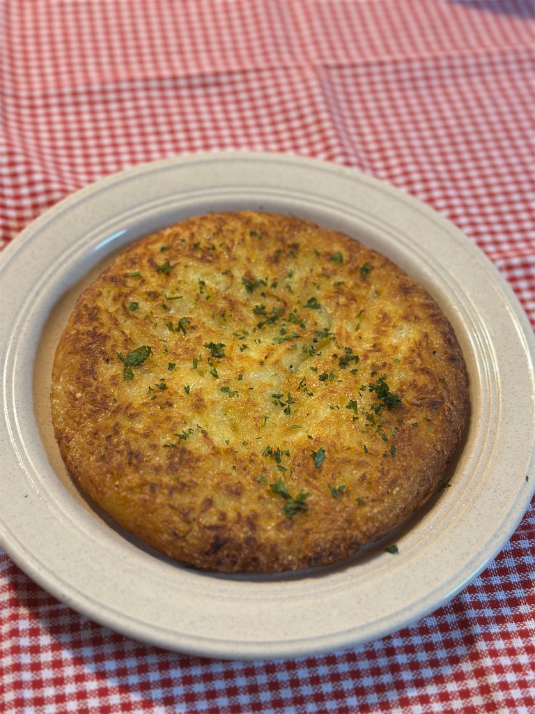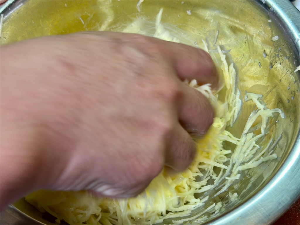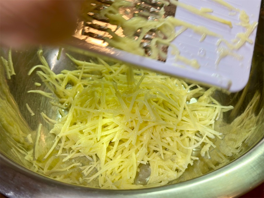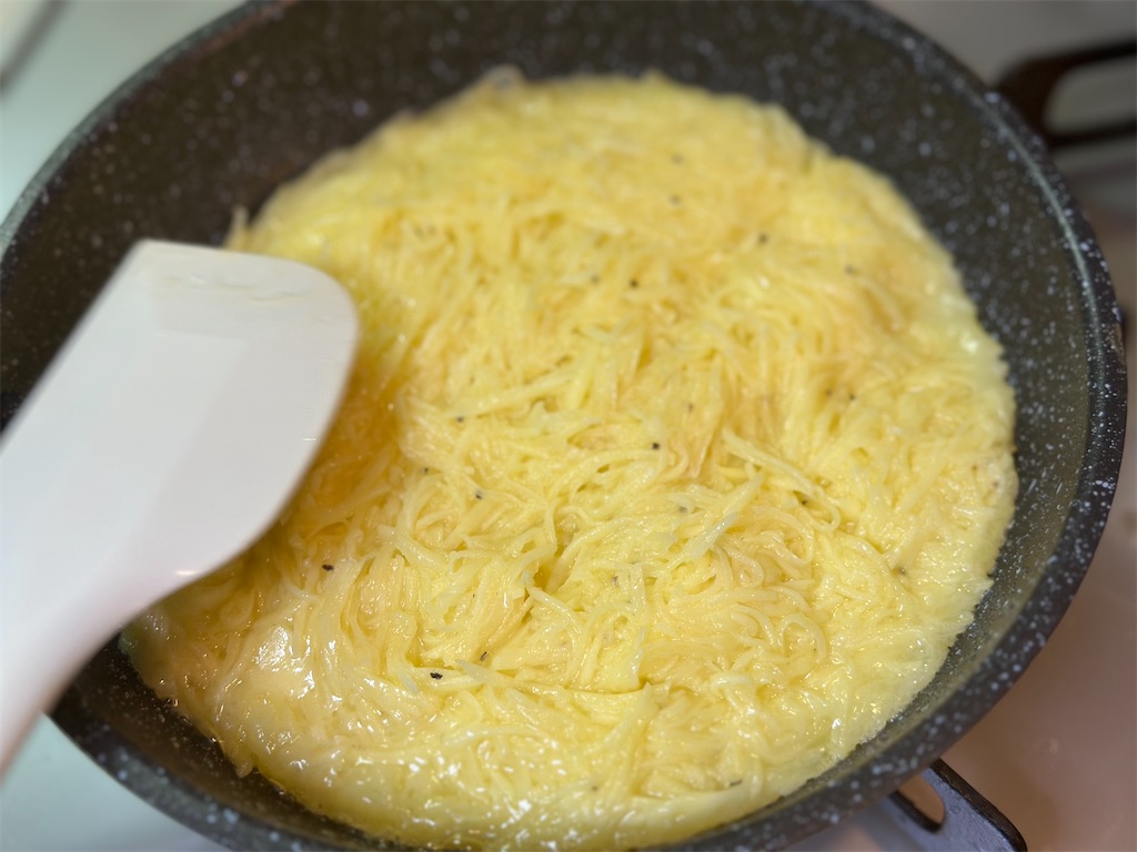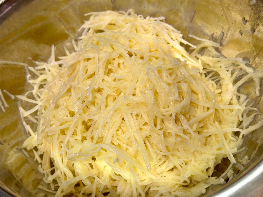 じゃがいもを千切りにして、じゃがいものデンプン質を利用することで、固めながら焼くというもの。