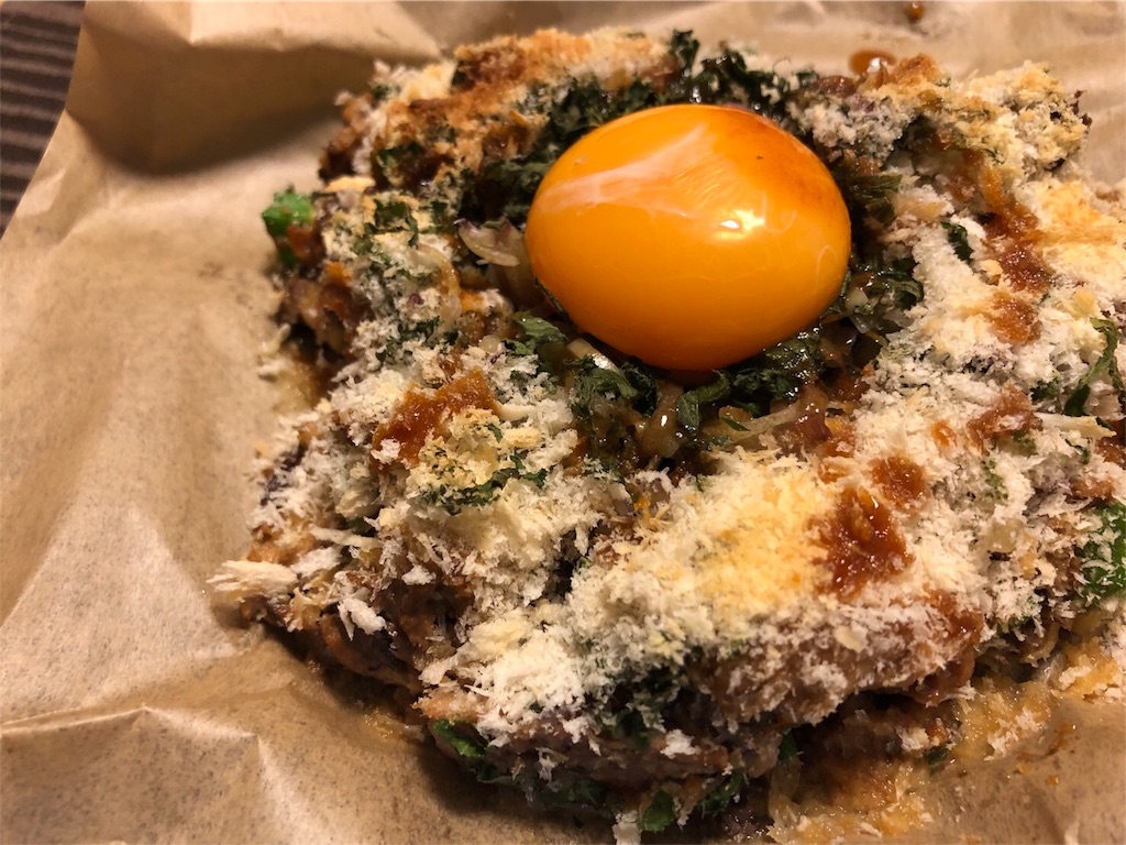 パン粉のサクサク、味噌と卵黄がマッチして、濃厚。大葉とミョウガがいい仕事しててうまい。