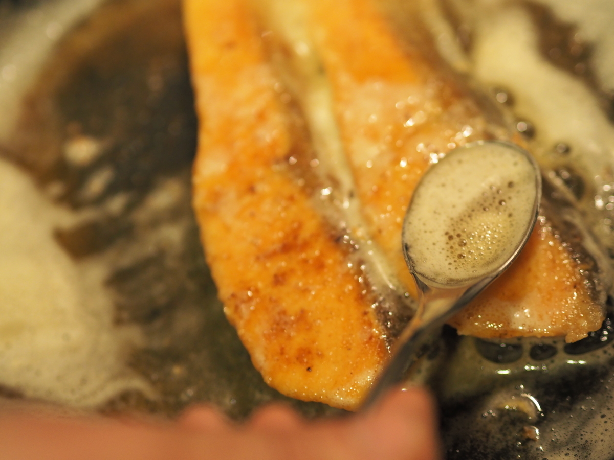 スプーンを使い、バターの泡をかけながら表にさらに香ばしい焼き色をつけていきます。
