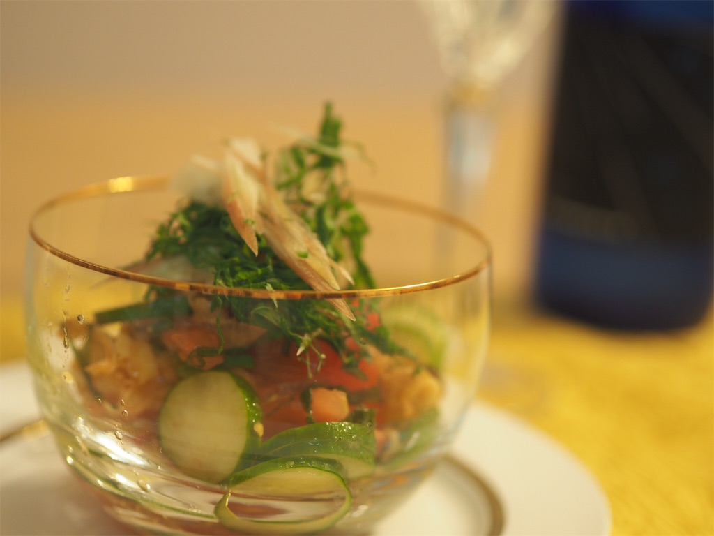 30分たったら盛り付けて、みょうが、大葉を飾り完成です。