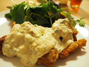 秋刀魚のうまみ、苦味、野菜の甘み、酸味のバランスが絶妙でうまい!オレンジジュースと秋刀魚?と思わず、大人な味わいを試してほしい!