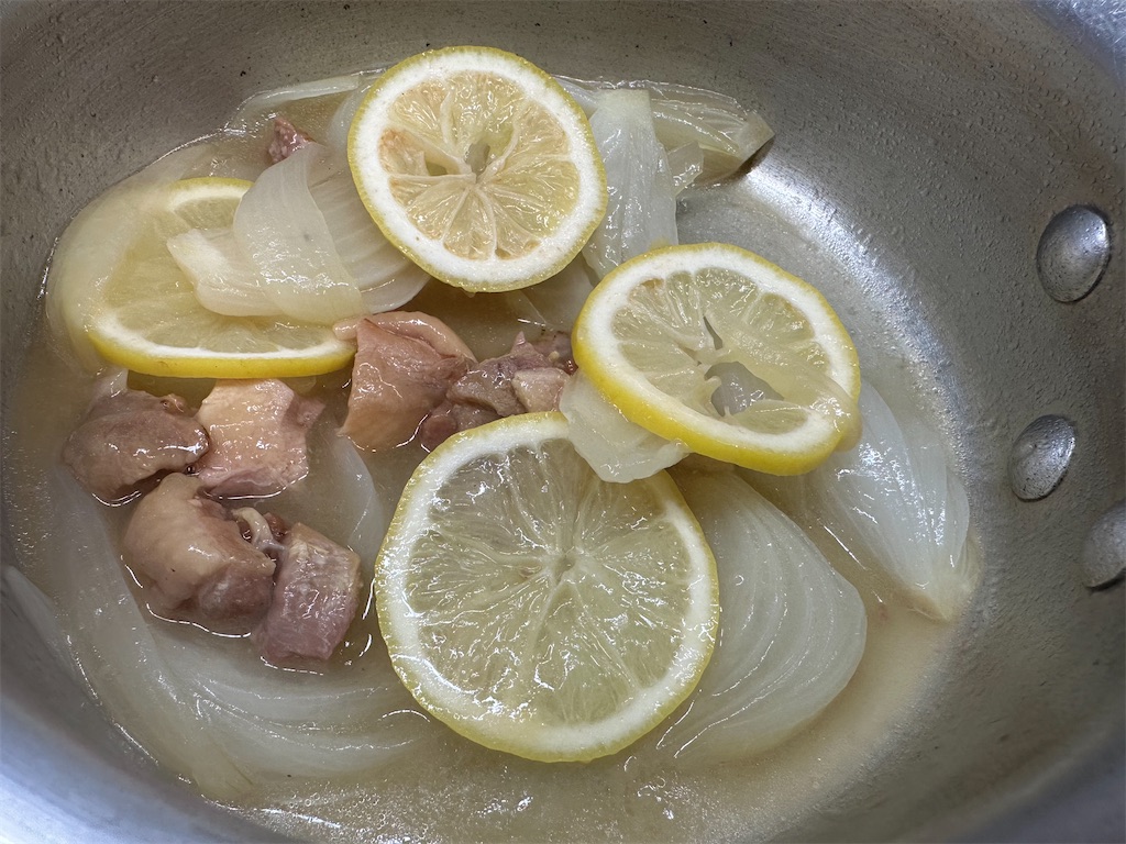 10分したらレモン、塩レモン缶をいれて2分ほどさらに蒸し煮にします。