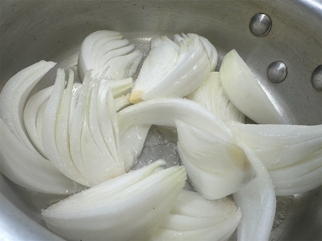 最初に塩をすることで玉ねぎからも水分が出て、甘みが増します。