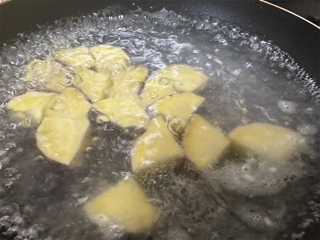 鍋に水・さつまいもを入れて沸騰させ、2分ほど下茹でします。