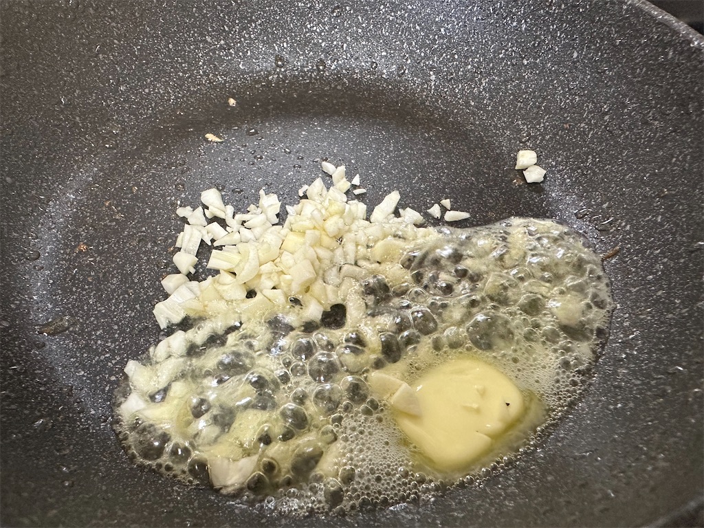 弱火にして、バター・にんにくを入れます。
