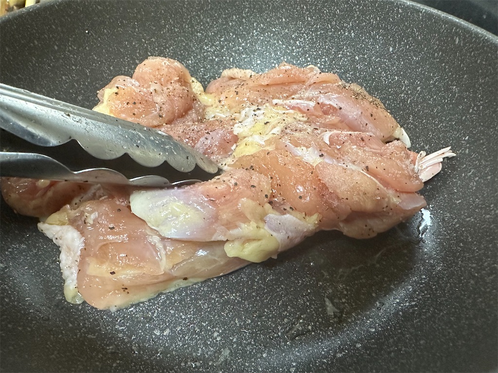 鶏もも肉の皮面ではない方に、塩・ブラックペッパーで下味をつけます。