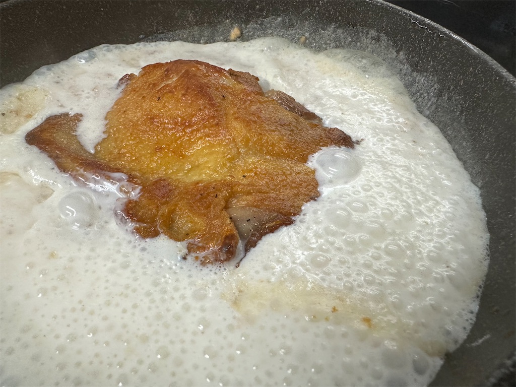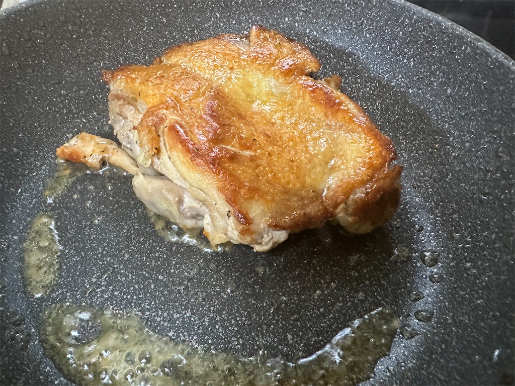 ひっくり返したらさらに5分ほど焼き、鶏肉に完全に火をいれます。