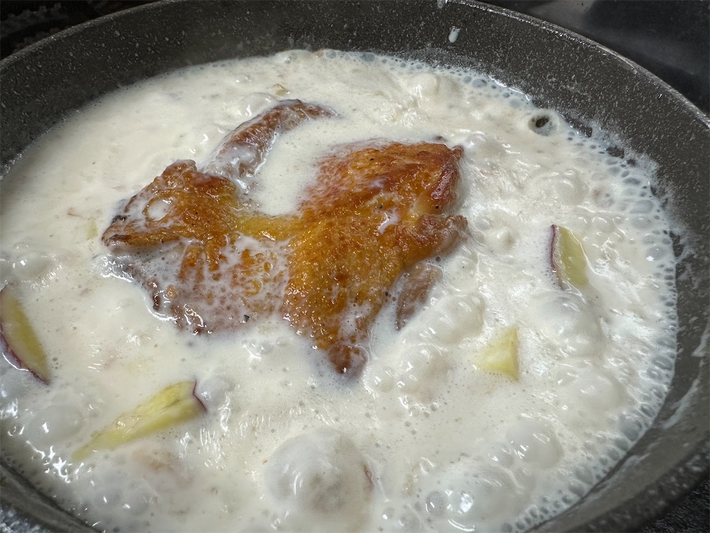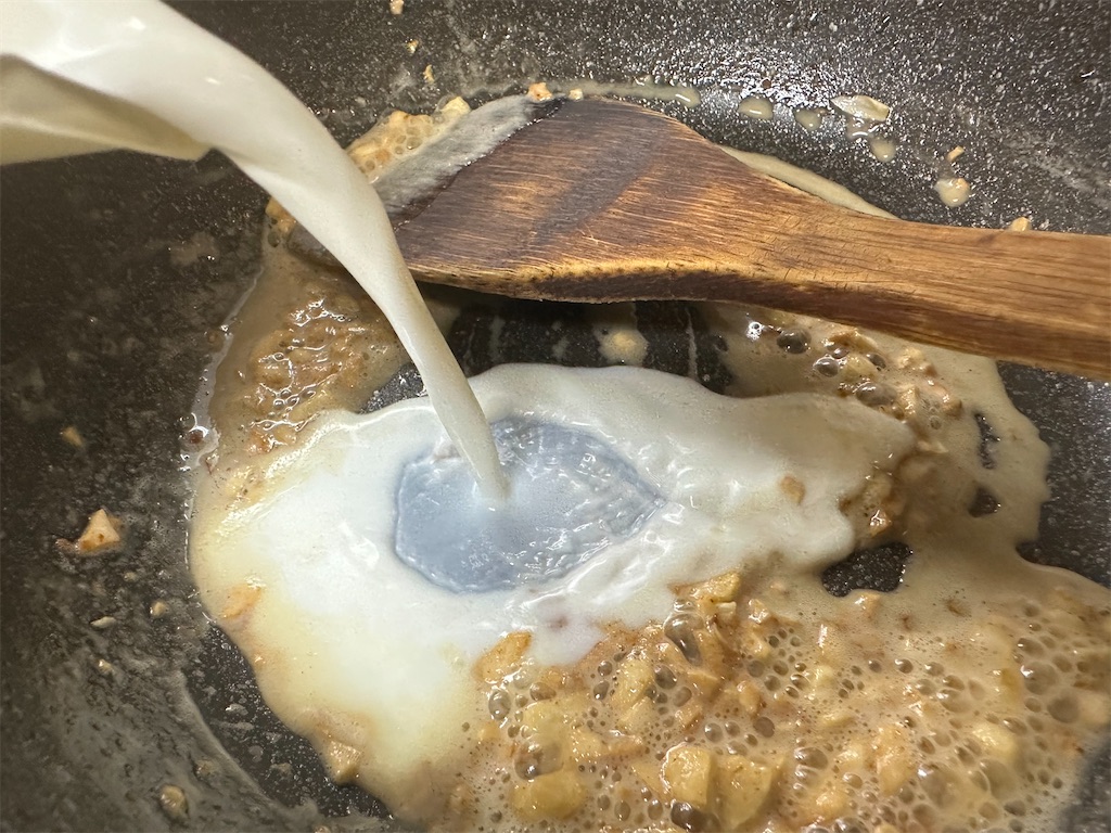 今回は、生クリームをこの料理のために買ってしまうと余ってしまうかもしれないので、牛乳のみで作りました。