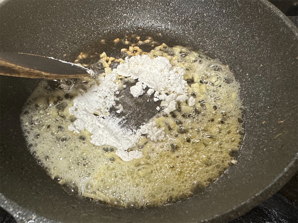 小麦粉をいれ、焦げ付かないように混ぜながら3分ほど小麦粉に火を入れます。
