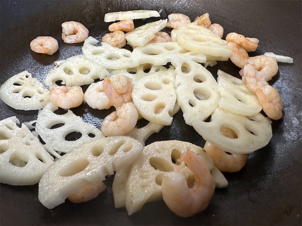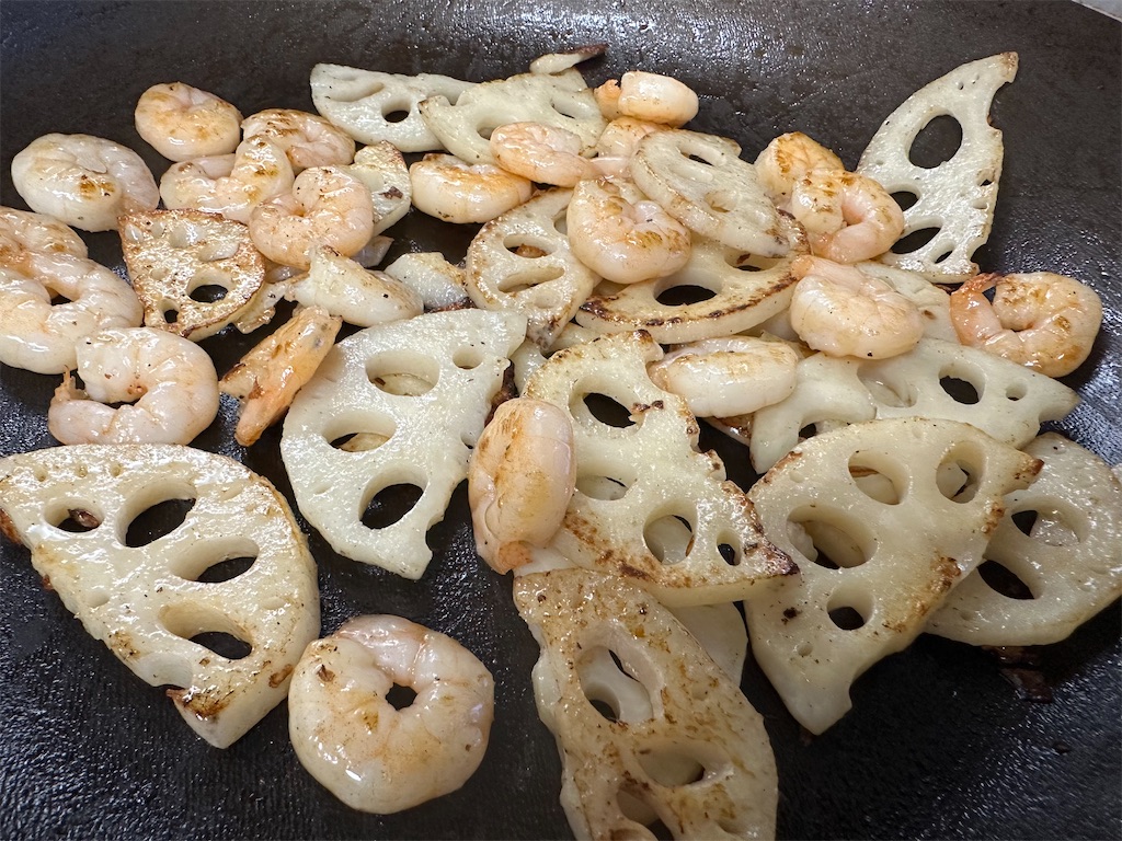 レンコンとエビに焼き色がついたら、一度取り出します。