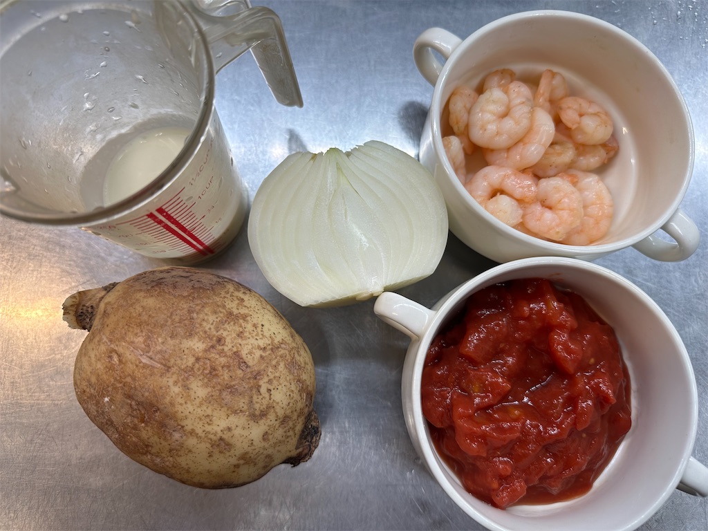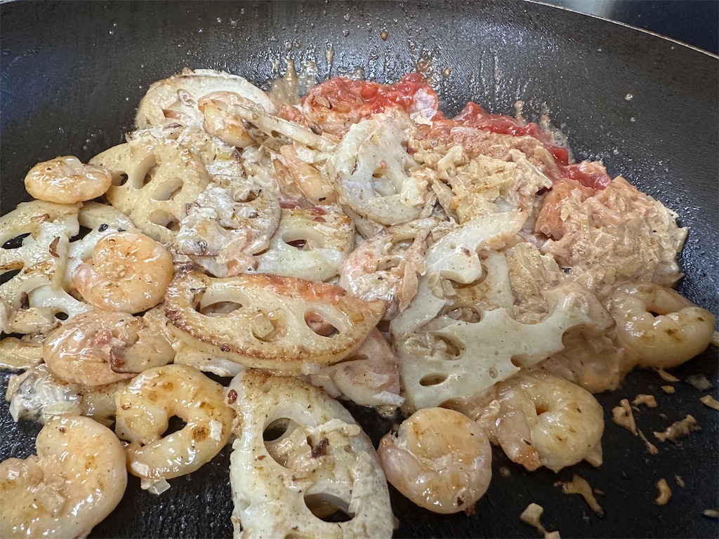 「エビとレンコンのトマトクリーム炒め」のポイント