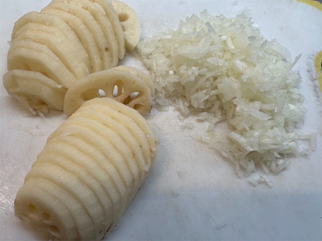 レンコンは皮をむき、大きければ半分にカットして、5ミリほどの厚さにスライスにします。