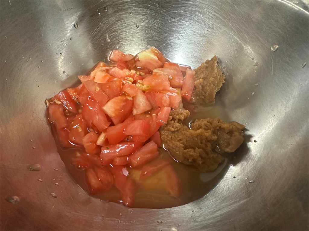 トマトを角切りにして、白ワイン、合わせ味噌と混ぜ合わせます。