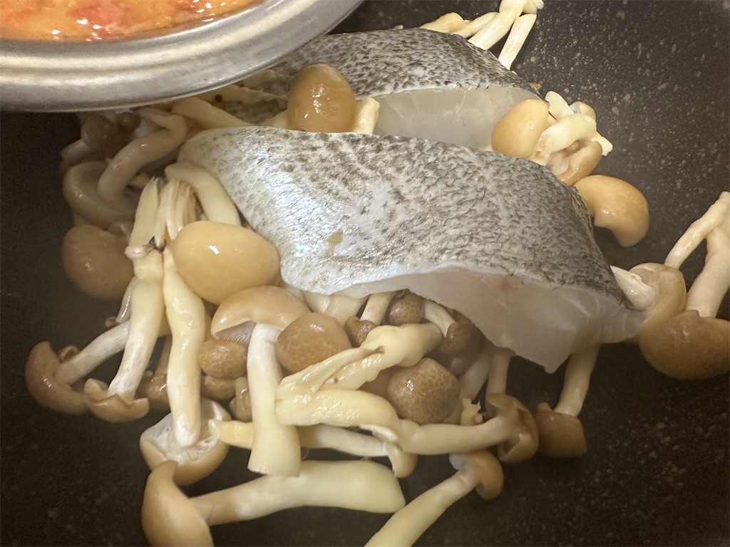 フライパンにカットしてほぐしたしめじ、スズキをいれます。