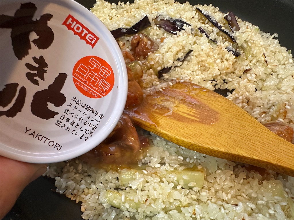 やきとり缶たれ味で作る「ナスのコクうまリゾット」のレシピ